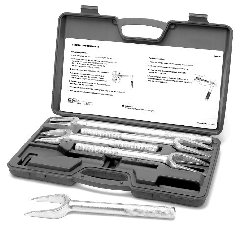 For separating most types of pitman arms, tie rods and ball joints found on automotive and light truck appliactions. Complete coverage set featuring five different sizes, including separators for late model Ford and GM pickups. Bilingual instructions.